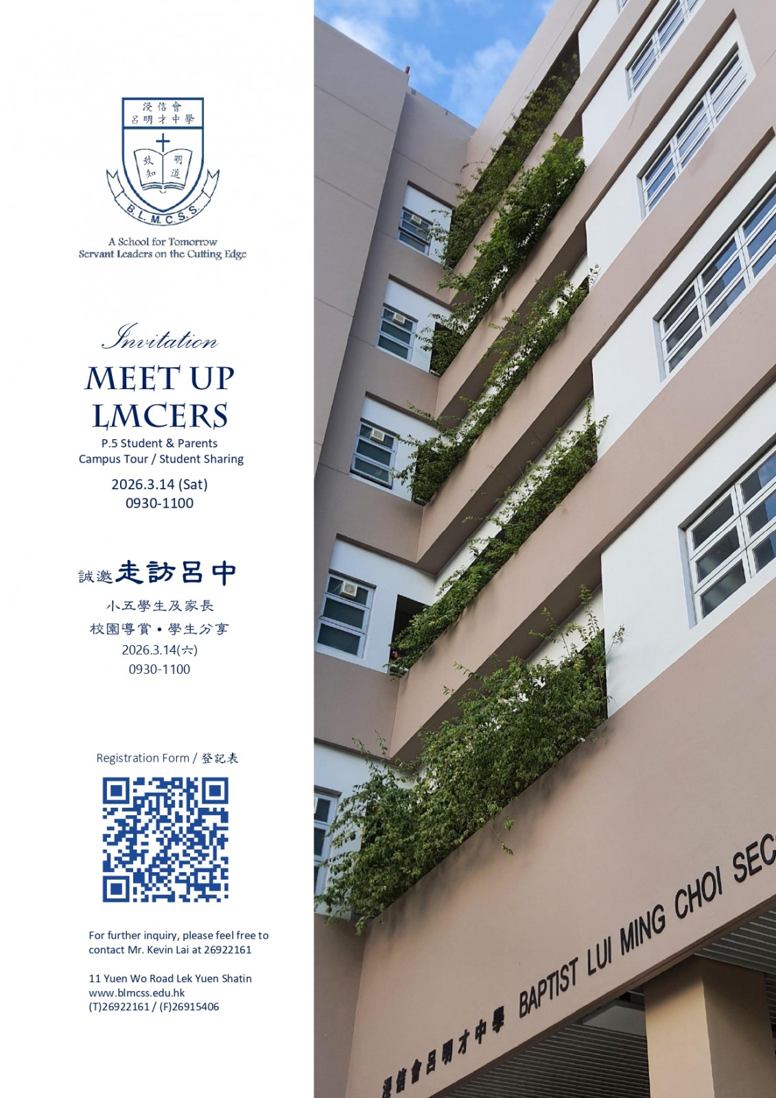 我們誠邀本年度為小五學生和家人於2026年3月14日(六)「走訪呂中」,活動內容簡約,包括由呂中學生帶領參觀校園,與您分享呂中的校園生活。您若樂意用一點時間認識我們,可掃描活動海報上的二維碼登記到訪。我們期待您來訪,一起度過一個輕鬆愉快的周末早上。