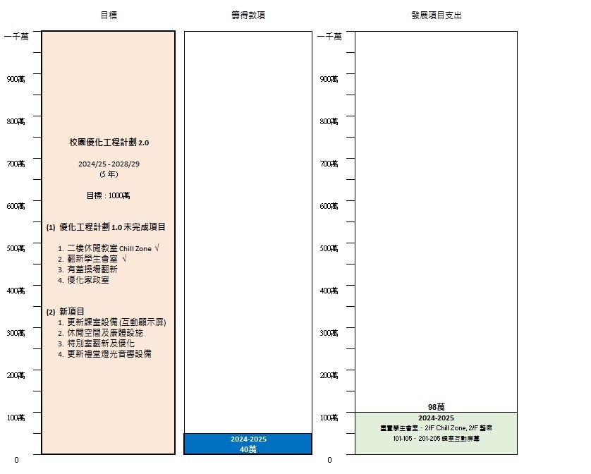 我們在2014/2015年度啟動校園優化工程計劃,為期10年,分兩期進行;旨在為廿一世紀學與教作好硬件上的準備,詳情可以參閱以下總覽表。