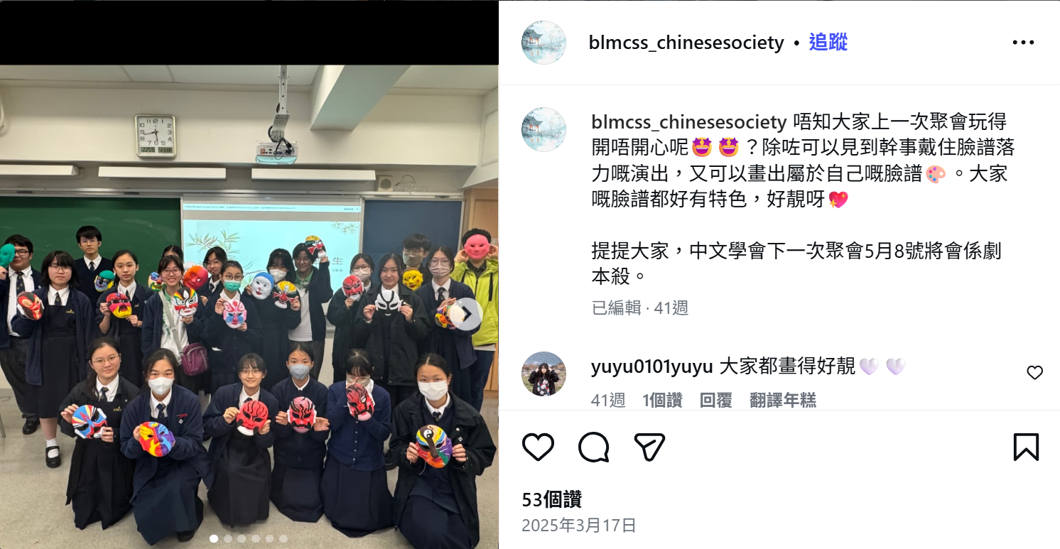 同學在中文學會Instagram (blmcss_chinesesociety)宣傳及分享活動照片