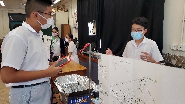 學生敢於向同儕介紹自己設計的太陽能煮食爐 (物理科)